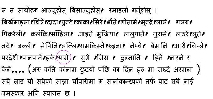 लौ आइपुगे म पनि गाम तिर यसो निस्केको साह्रै घाम भओ केरे अनि चौपारि मा आको कोइ पुनि रहेन्छन। साइला दाइ म पाल्पालि त होइन नि ,अनि स्याँजालि पनि होइन । म त माथि लेक पर्बत तिर को पो हो नि ।