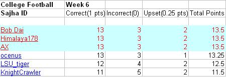 Here are the results of Week 6 (TOP 25 AP)College football Predictions actions. (One) point is given for each correct result. There were 17 top 25 total games last week. Since,everybody only guessed for 16 teams, that is out total teams for this week. I have awarded 0.25 points for the upset results, because I think this is important and seems pretty fair for the ones who take risk chosing the underdogs. :). For the Week 6, We had 3 upsets ( Auburn,California and Georgia's Loss against Arkansas, Oregon and Tennessee resp.) Hope ya' all will post your predictions for this week(week 7).