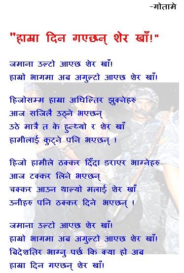 वाह! वाह! गोतामे ज्यू, अत्यन्त राम्रो कविता, समसामयिक एवं व्यंग्यात्मक। धेरै दिनपछि चौतारीमा तपाईको कविता पढ्न पाउँदा खुशी लाग्यो। अरू पनि लेख्दै गर्नुस् है!