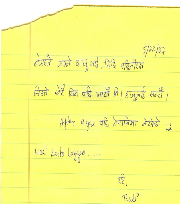 हन, ए साथि देसि कम्पाउन्डर! टुलिऊफुन अर्न परो रे? तिउँरो घराँ तो के जाति टुलिऊफुन पुनि छ? हो भुने एउ बाजी फुन अर्न पाए हुन्थो के रे। हाँरो अर्का गाम्ले १ साल अघि पिन्सिन लिन भुनेर हिंडेका थिए, अईले सम्मुन् देखा परेनन् त नि! गोरउपुर जानि भुन्थे के रे। तिँउरो देहात तिरै त हो नि, होईन्र? बडा मजाको थो के रे, नामै रिकुटे। चिनजान भए त पुन्टे दाजीले सम्झना अरेछ भुनेर खबर पु-याईदेओ, कल्याण हुने थो।