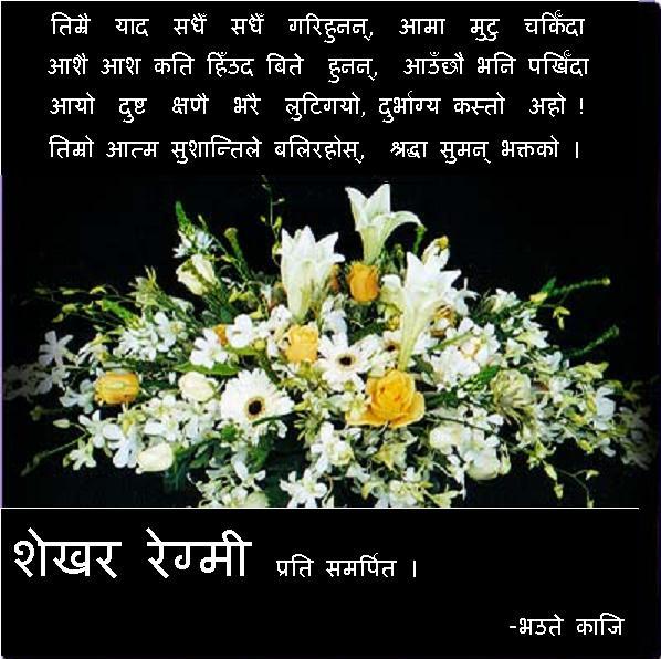 नयाँ क्यै छ कि भनेर हेर्नु भएकोहोला मित्रहरु। माफ गर्नुहोला। यो त भर्करै टेक्ससमा अकालमै ज्यान गुमाउन पुगेका भाइ शेखर रेग्मीको परिवारको अवस्थालाई (विशेष गरेर जन्म दिने आमालाई) सम्झेर कोरेको उनै प्रति समर्पित टुक्रा यो धागोमा संकलन गरुँ भनेर मात्र हो।