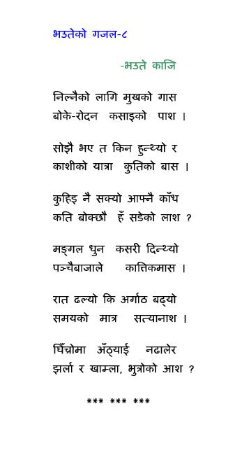 ए ईश्वर बुरो, म हजुर कै प्रतिकृयाको प्रतिक्षामा थिएँ। हजुर प्रधान-सम्पादक भएको त्यो मुखपत्र अहिले साथमा छ ? त्यसमा पनि टाँसेको थियो नि त हगी।खै मैले त के के सम्झेँ सम्झेँ अलि अलि थप-थाप गर्नु पर्यो, नसम्झिएर। त्यो मैले स्कुलमा हुँदा लेखेको थिए, अनि पोखरा क्याम्पसमा आइ इ पढ्दा "सृजना" हो कि "सम्बाहक" लाई दिएको। त्यो हजुर सँग छ भने टाइप गरेर खुसुक्क ईमेल गरम न प्रभो। गौतम जी, वास्तबमा मेरो हजुरबुबाले छन्दमा कविता लेख्ने गरेको हुनाले र त्यो सुन्ने गरेकोले सानै देखि मलाई छन्द-बद्ध कवितामा शोख थियो, लेख्न नसके नि पढ्न भनम न अब। तर अहिले धेरै बिर्सिसकेछ। समय मिल्यो भने सम्झेको कुराहरु साझामा छलफल चलाउने बिचार गरेको छु। कोहि न कोहि यहाँ पनि होला नि एक्सपर्ट। :-) -भउते