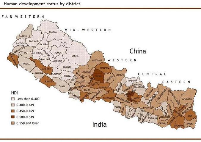 समुन्द्र जी, आफू नि नउशाको पिरफेसिनल (professional) चैं परिएन, यो त मेरो हप्पी (hobby) मात्र हो। त्यसैले म सँग नि त्यस्तो राम्रो खाले नउशा भेटिएन। यौटा गुगलको बुटाँ चढेर भेटेको याँ टाँस्दिन्छु र त्यसको ठेगाना पनि दिन्छु। गुगल अर्थ भन्ने चीज डाउनलोड गरेर हेरौं न, त्यसमा चढेर तपैं एक सेकेन्डमै संसारको जुन कुनाँ नि पुग्नसक्नु हुन्छ। लौ यो नउशा तपैंलाइ कतिको सहायक सिध्द हुन्छ हेर्नुस्। अनि स्रोत: - http://www.un.org.np/uploads/reports/maps/hdi/Nepal-HDI-districts-2004.png