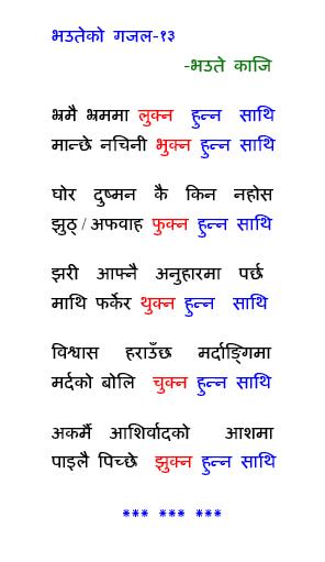 spyboy, धन्यबाद, सुनिदिनु भएकोमा। lfc123, गाम्ले हुनुहुँदोरे'छ , खुशी लाग्यो। शिरिष गुरु, बीचमा पुच्छर फुत्क्यो के, अब फेरि समाउनु पर्यो। :-) पुन्टेदाइको सालीको कुरो गर्दा गर्दै गजल फुर्यो गाँठे, टाँसिहाल्न परो। यो गजल चैँ पुन्टेदाइ कै साली प्रति समर्पित, लुज्जा त। :-) :-) -भउते