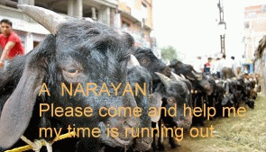 G: What are you saying? Can?t you see the simple difference? Are dogs animals or not? Do you see how much affection the pets get in America? I said just to point out that they do feel pain as we do. If you?ve to die, which way you?d prefer to die among all other method you?ve described? Do you know when ?human sacrifice? were banned in Nepal? Do you see any difference of ideas between ?human? or ?animal? sacrifice? They can?t do it for human so they do it with animal. As long as we don?t agree any kind of sacrifice is bad, we?ve not seen the TRUTH. One more story, I watched in STAR News about ?bali? given of a small kid. It?s obviously because they think it has more power with kid?s bali than animal bali.