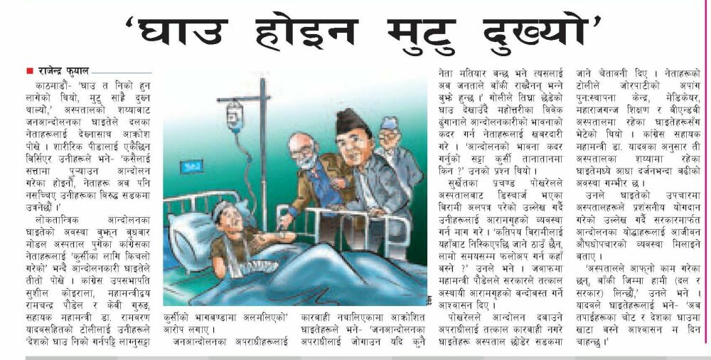 नेपाल समाचारपत्र काठमाडौं सातै दलको सहभागितामा तत्काल सानो आकारको मन्त्रिपरिषद् बनाउन सहमत भए पनि मन्त्रीहरूले दरबारमा गएर शपथग्रहण गर्ने र मन्त्रालयको भागबन्डाका विषयमा विवाद उत्पन्न भएपछि सात दलले सोमबार पनि मन्त्रिपरिषद् गठन गर्न सकेनन्। प्रधानमन्त्री गिरिजाप्रसाद कोइरालाको शपथग्रहणमा ढिलाइ र सात दलबीच उत्पन्न विवादका कारण देश छ दिनदेखि सरकारविहीनताको स्थितिबाट गुज्रिएको छ। जनआन्दोलनको सफलतास“गै आन्दोलनरत दलले सत्ताको भागबन्डामा आफूहरू नअल्भिmने र दलीय स्वार्थभन्दा माथि उठेर राष्ट्रिय समस्या समाधान गर्ने भनी व्यक्त गरेको प्रतिबद्धता पा“चौं दिनमै खण्डित भएको छ। नेपाली कांग्रेसका महामन्त्री रामचन्द्र पौडेलले आप्ः्नो पार्टर्ीी उपप्रधानमन्त्री र गृहमन्त्री नछोड्ने अडान राखेपछि सोमबार बिहान र बेलुका बसेका बैठक निष्कर्षवहीन हुन पुगे।