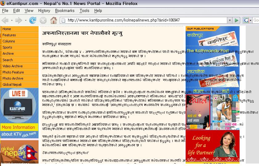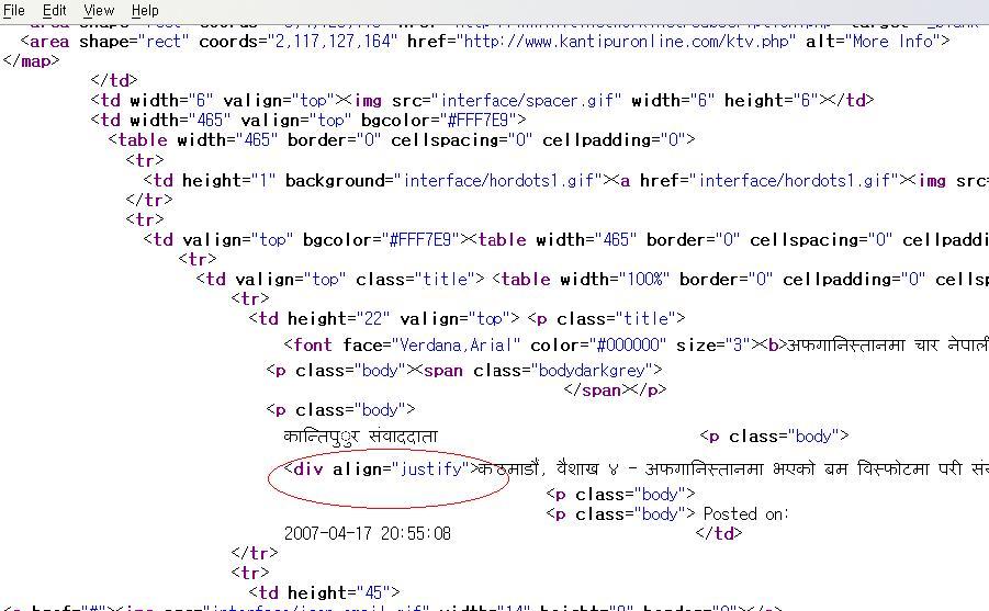 Hello Kantipur Webmaster dude (or aka Dhiraj Shrestha ) This is my kind request to make for firefox browsing compatible on kantipuronline, nepali kantipur section of the site. Now, only front page is okay to view in firefox but the inside page is not correctly displaying. For your reference I am sending the screenshot of your inside page with this email. You don't need to do big change, just replace the font justify ( , instead you could do it left justify ( ) , which will solve the nepali font display problem in firefox browser. Or you could also test to nepali kantipur page on Mozilla Firefox which can download free from ( http://www.mozilla.com/en-US/firefox/) (Note: Despite many personal email, you didn't responce. I got your name after googling on your published email on Kantipur site) If any SajhaBashi know to this guy please pass this message.