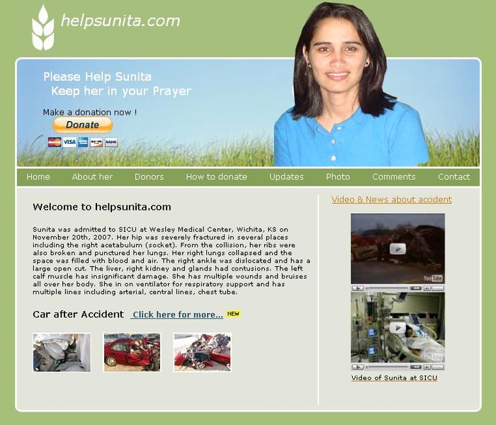 Sunita was admitted to SICU at Wesley Medical Center, Wichita, KS on November 20th, 2007. Her hip was severely fractured in several places including the right acetabulum (socket). From the collision, her ribs were also broken and punctured her lungs. Her right lungs collapsed and the space was filled with blood and air. The right ankle was dislocated and has a large open cut. The liver, right kidney and glands had contusions. The left calf muscle has insignificant damage. She has multiple wounds and bruises all over her body. She in on ventilator for respiratory support and has multiple lines including arterial, central lines, chest tube.