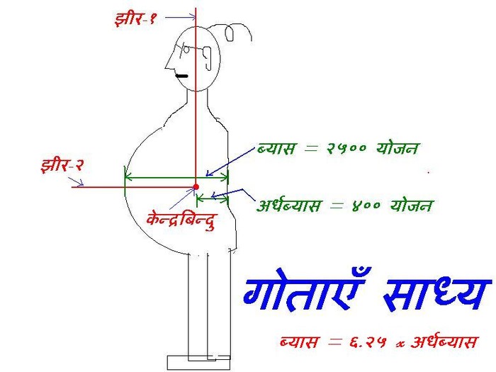 अर्धब्यास चारसय योजन हुँदा ब्यास चैँ पच्चिससय योजन हुने द्वन्दात्मक भौतिकबाद बुझ्नको लागि गोताएँ साध्य जान्न जरुरी हुन्छ। यसको लागि गोताएँलाई चौतारीको ठूलो ढुङ्गोमा ठड्याऔँ। अनि मलायको लाहुरेमा भर्तिगर्न नाप्न ला' जस्तो गरि सिधा ठाडो हुन लगाएर एउटा झिर टाउको बाट सिधै पर्फेक्ट भर्टिकल हुने गरि अनि अर्को झीर भुँडीबाट सिधै पर्फेक्ट होरिजेन्टल हुने गरि उधिन्नौँ। अब ती दुइ झीरहरु जहाँ भेट्छन त्यो बिन्दुलाई केन्द्रबिन्दु मानौँ। अब अर्धब्यास नाप्न केन्द्रबिन्दु बाट पछाडि ढाड तिर नाप्दै जाउँ। यसले चारसय योजन देखाउँछ। ब्यास नाप्नको लागि अगि झीर छिराएको भुँडीको बिन्दु देखि सिधै पछाडि ढाड सम्म जाउँ, यसले पच्चिससय योजन देखाउने छ। विस्तृत जानकारीको लागि तलको रेखाचित्र अवलोकन गरौँ।