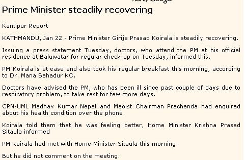 Girija Prasad Koirala is passed away. It hasn't flashed out yet. Probably it will by tomorrow.