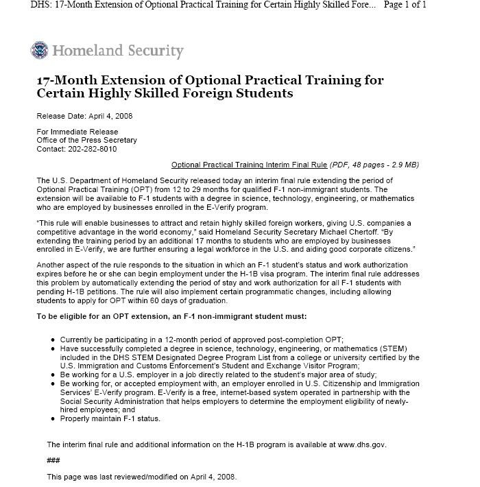 The U.S. Department of Homeland Security released today an interim final rule extending the period of Optional Practical Training (OPT) from 12 to 29 months for qualified F-1 non-immigrant students. The extension will be available to F-1 students with a degree in science, technology, engineering, or mathematics who are employed by businesses enrolled in the E-Verify program.