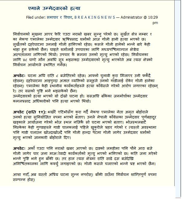 हाहाहा कस्तो मजाको कुर (हम्रो हजुरबाले हरुवा कुकुर्को भुकाइ भन्नु हुन्थ्यो तेस्कै याद आयो)। अब तेसो भय नेपाली काङ्रेस र एमाले ले उनीहरुलाई सत्ता छोडीदिनु पर्ने भो? कस्तो कुरा यो। केटा केटी जस्तो कुर नगरनुस्। धेरै भयो बेबी सिटिङ अब आफ्नै खुट्टा म भुइमै टेकेर हीड्नु पर्छ। डर, धम्की ले सत्त हत्त्यौन खोज्नु धेरै मुर्खता हो। हीजो को दीन्मा आफ्नो पार्टीको बिरोध गर्नेलाई बर्गिये सत्रु भनेर सखाप पर्ने खोज्ने ले आफ्नो पत्ता साफ हुने बेलामा बहुला जस्तो बेबहार गर्नु कुनै अस्व्भभिक भने हैन। हीजो दीन्मा माओवादी म लाग्ने ६० पर्तिसत भन्दा भदी मान्छे डर, धम्की र केही निहित स्वार्थले लागेका थीय। बाँकी ४० प्रतिसत जस्लाई जन मिलिसि भनेर आफ्नो ज्यानको तिलन्जली दीन तयार गरैएक छन, कठै तीन्ले के सिध्हन्त बोकेका छन र। सरकारले खाली पेट भरी दीयोस र अरु सुबिध दीयोस भोली नै माओवादी को कम्प रित्तिन्छ। भयो, यो कुरमा धेरै नजाउ। आफु पराजित हुन्छु भन्ने डरले आकरमन गरेक हुन भनेर आफ्नो सोचै प्रती प्रश्न उठौने ठाम नदिनुस्। एउटा मानीस्ले अर्को मानीस्लाई घती रेतेर तड्पै तड्पै मार्न सक्छ? माओवादी ले सक्दो रहेछ। एसता रक्त पीपासु हरुको राज कदापी स्विकार्य हुने छैन।