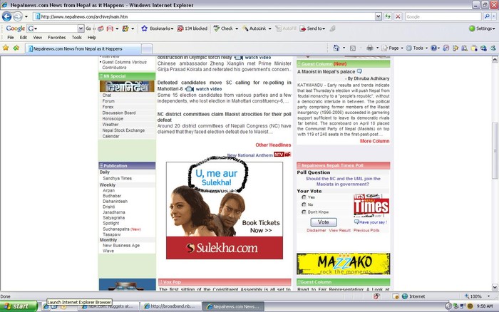 Actually when you suddenly notice that ad it immediately makes me feel something is not right. First of, I wonder if Sulekha or Nepalnews got permission from Ajay and Kajol Devgan to use their faces on that ad. Second of, the Hindi word "Aur" is not suitable in a premier Nepal news portal, I think. On the other hand, the people who conceived the ad caption plausibly seems to be driving at the Devgan home production "You, Me aur Hum" in tandem while advertising for Sulekha. This ad on the contrary could provide promotional exposure to the movie indirectly. My finger finally points to Nepalnews.com who is presuming that Hindi is an alternative language for Nepali news media outlets no matter how minuscule the desi word like "Aur" is. When the language from across the Southern borders get too many helping hands, this is what happens: (Observe the picture provided below.)