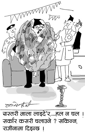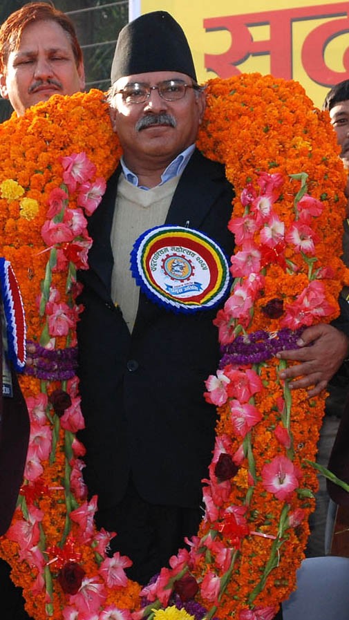 This fool Prachanda doesn't know the suspense behind this phools. There are as many flowers as the number of innocent Nepalese killed Prachanda and his cronies... this is what Prachanda bahun is missing.. he thinks he is being honored... Nope.. whoever came up with the idea of making that garland thought about the nepaelse killed by Prachanda.. But these daanav Prachanda is enjoying.. Let him enjoy.. let him get used to such thick garlands... where ever he goes people shoudl honor Prachand bahun using as big garland as possible.. And one day, BOMB !!! ha ha. Then that would be the real justice done to those who were murdered by Maoists.